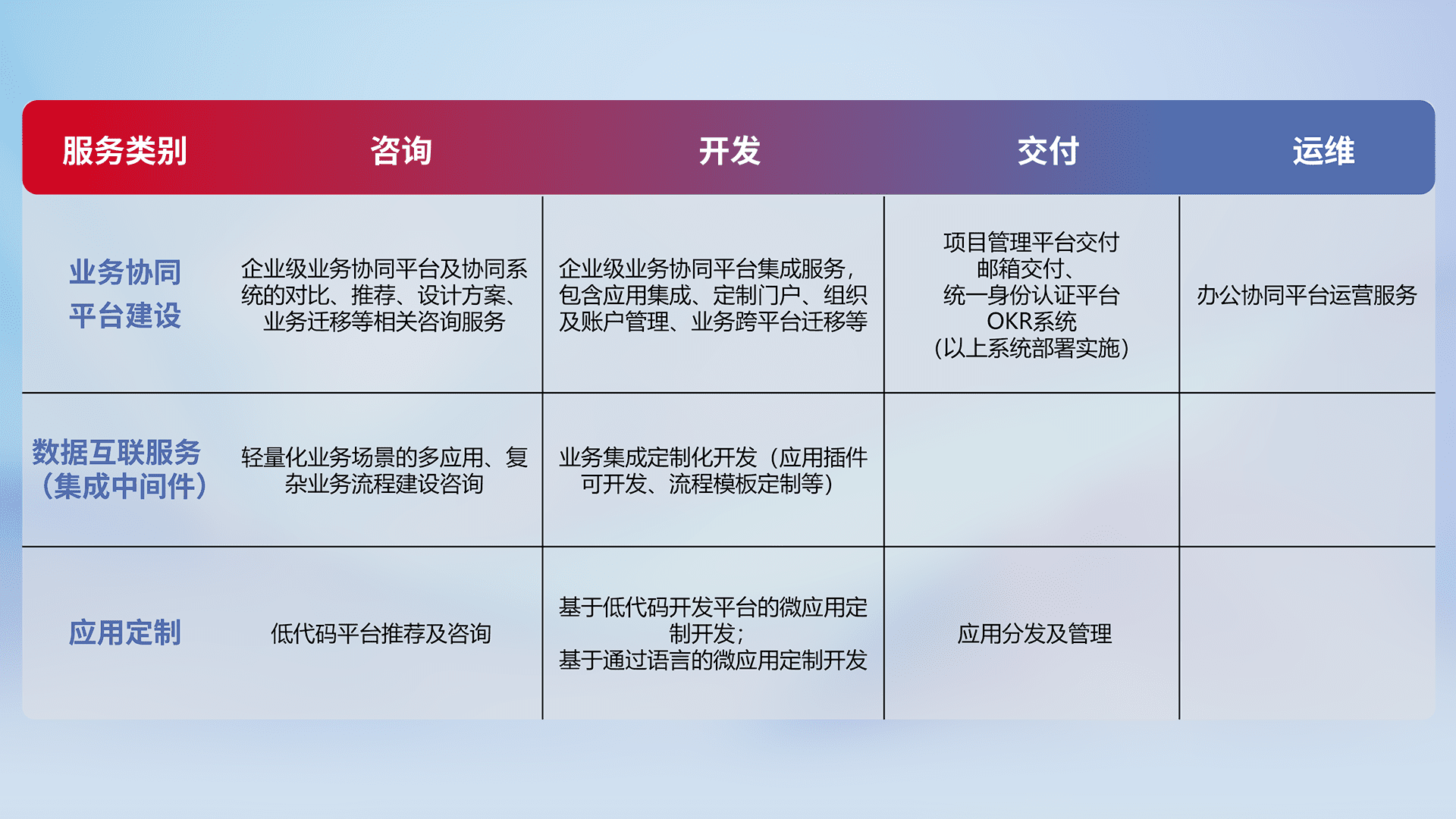 针对钉钉、、、、企微、、IDaas等平台级产品提供产品的规划、、方案、、、交付、、、定制化开发等服务,,实现如统一协同办公、、、智能客户服务、、混合会议管理、、、智能数据查询、、、等业务场景,,,实现数字化转型。。。。
