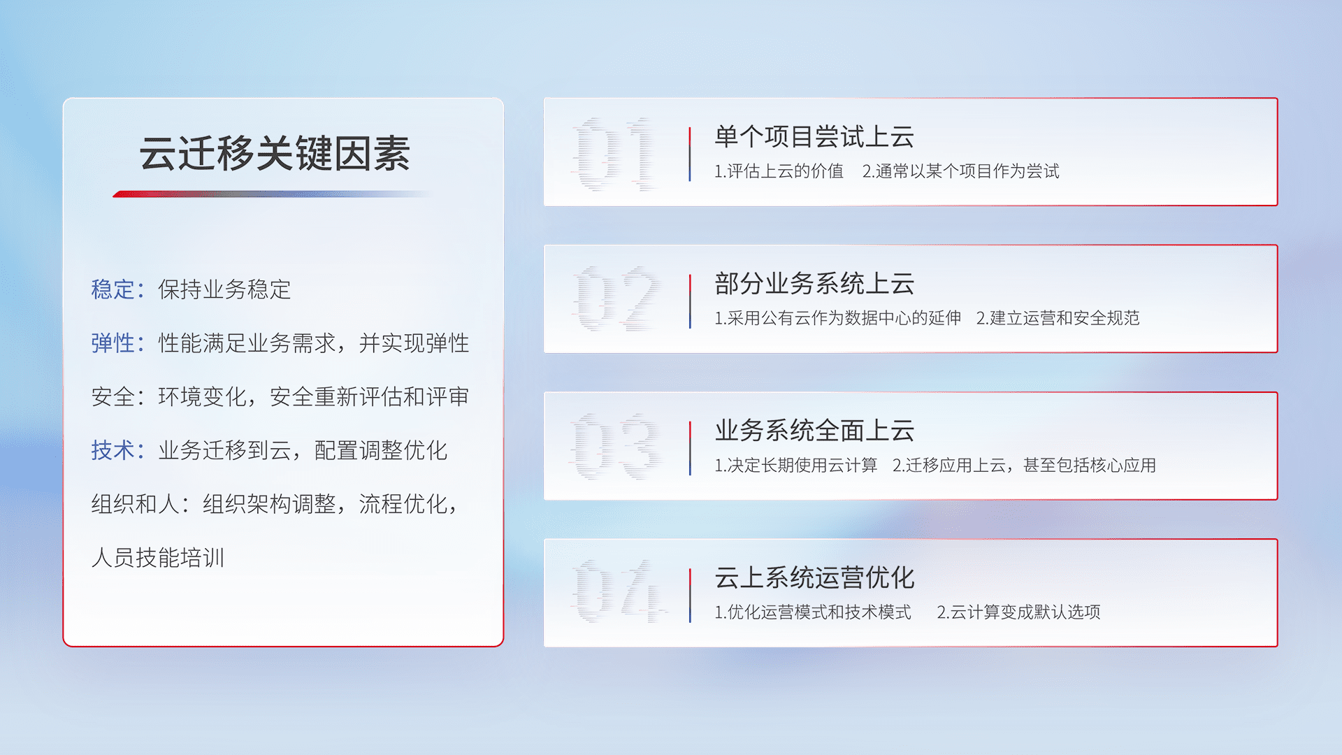 结合实际业务,,,从规划设计、、、云平台选型、、云原生改造、、、、数据迁移、、集成交付,,,,迁移全过程为客户识别最佳上云路径,,,,做好风险识别管理,,设计网络架构、、身份权限、、、安全审计合规、、操作审计、、、、日志审计、、监控告警策略、、多站点容灾设计等,,对云上基础设施进行整体规划,,提升IT治理水平,,以满足弹性、、、、高可用、、、、高性能的需求。。