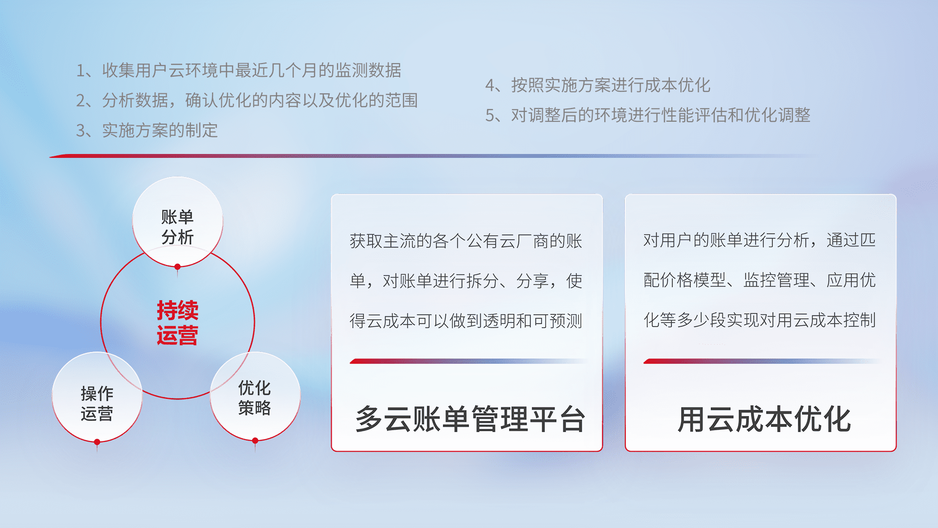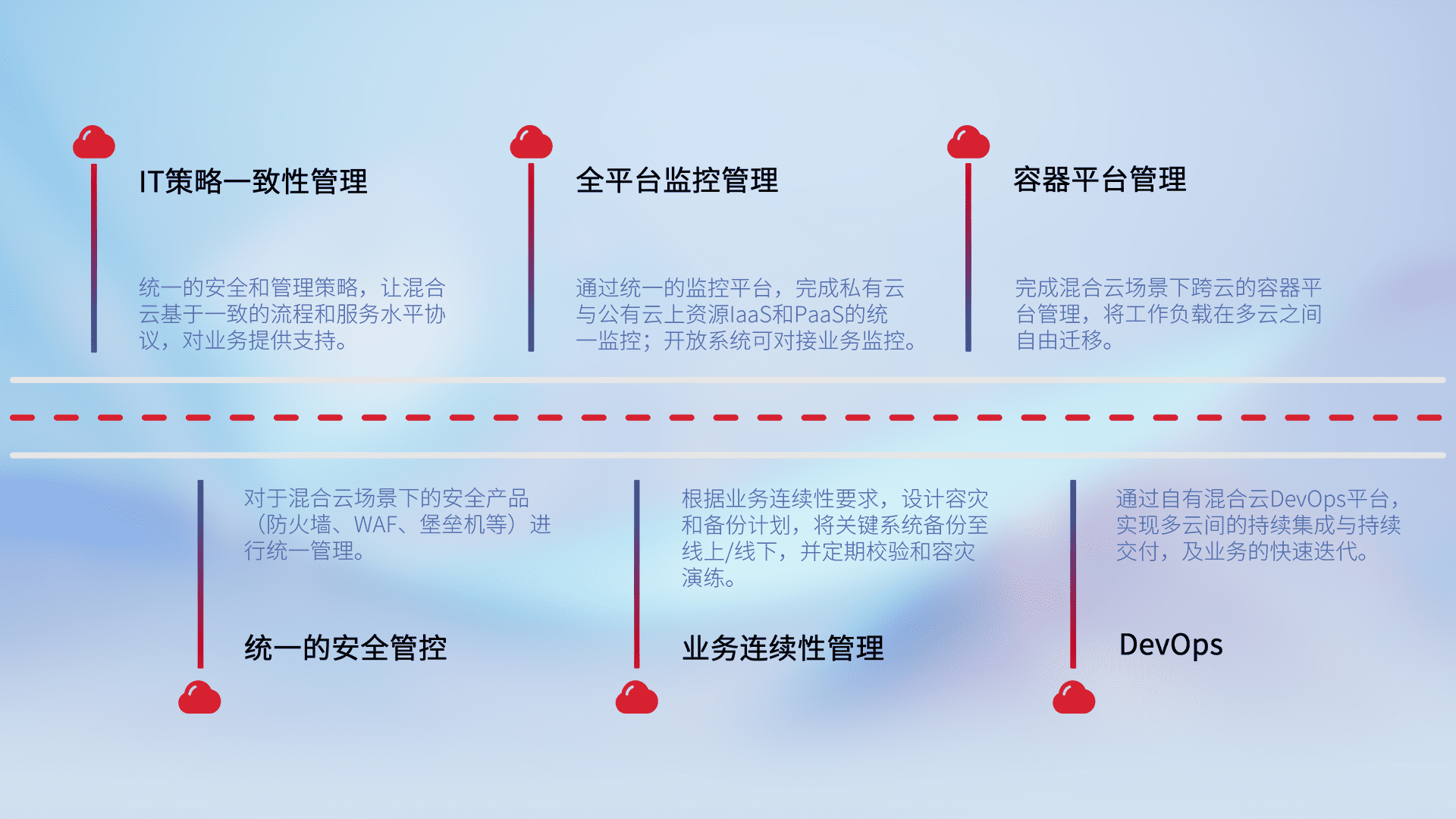 通过多云纳管,,,以统一的资源数据模型把客户的云资源进行抽象和封装,,,,进而实现对多云资源的统一操作,,,保障云资源管理的可靠性、、、稳定性与可用性。。。。量身定制化运维内容,,,配置、、开发运维、、补丁管理、、备份、、、、监控、、、、认证和访问管理、、、审计和日常巡检等,,,保障在用云过程中的可靠度,,,,稳定度以及高可用率。。。。