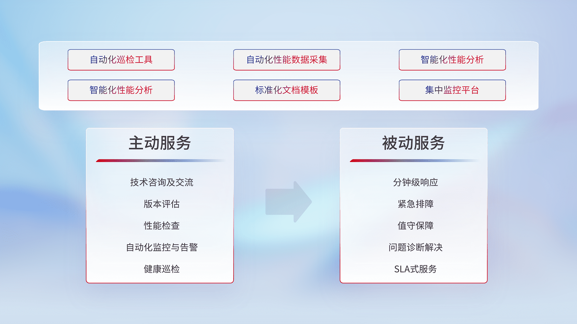 智能化工具和标准化文档,,保障服务质量,,提供主动服务(包含技术咨询、、、版本评估、、、性能检查、、、自动化监控与告警、、、健康巡检)和被动服务包含(分钟级响应、、、、紧急排障、、值守保障、、、、问题诊断解决、、、SLA服务)。。。